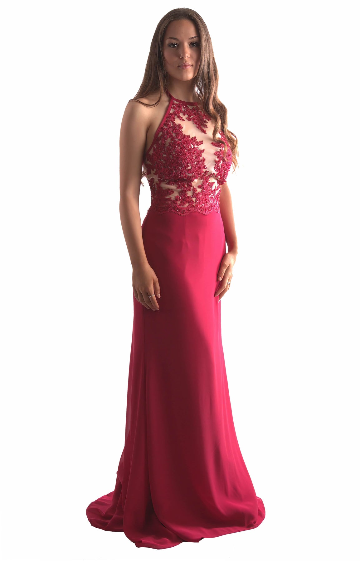 Halter neck figure hugging dress. This beautiful chiffon dress is stunning. Fully lined with two layers of satin, boning and cups also help create the structure of this dress. Hand beaded applique on nude tulle.