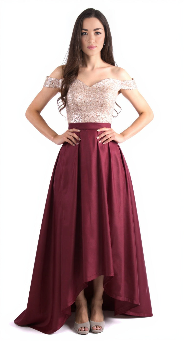 Sweetheart off-shoulder sequin dress. Soft satin hi-low skirt. Quirky, unusual, bridesmaid, evening or prom dress. Timeless design, fabulous shoes essential!