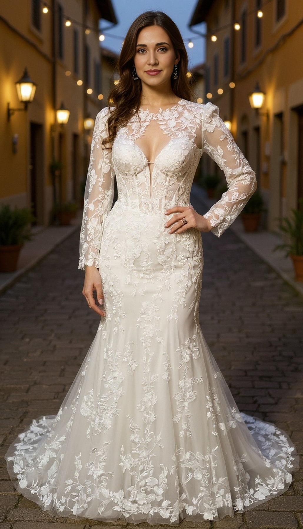 The plunging neckline brings bold energy, perfectly balanced by delicate floral lace appliqués that cascade down the figure-hugging silhouette. The mermaid design hugs in all the right places and flows into a dreamy, chapel-length train that says, “Yes, I did come to slay.”