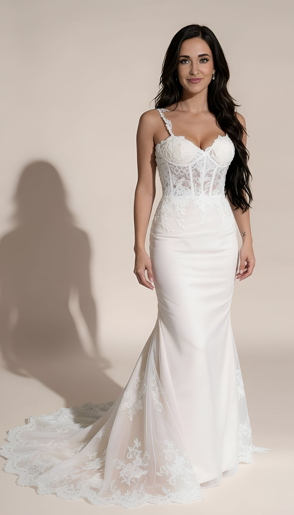 Ex-sample wedding dress. Boned, corset-style wedding dress. Layers of soft nude and ivory tulle make up the floor-sweeping fishtail bottom. Godet train, decorated in lace. Applique covered straps. Vintage style dress, perfect for a summer wedding.