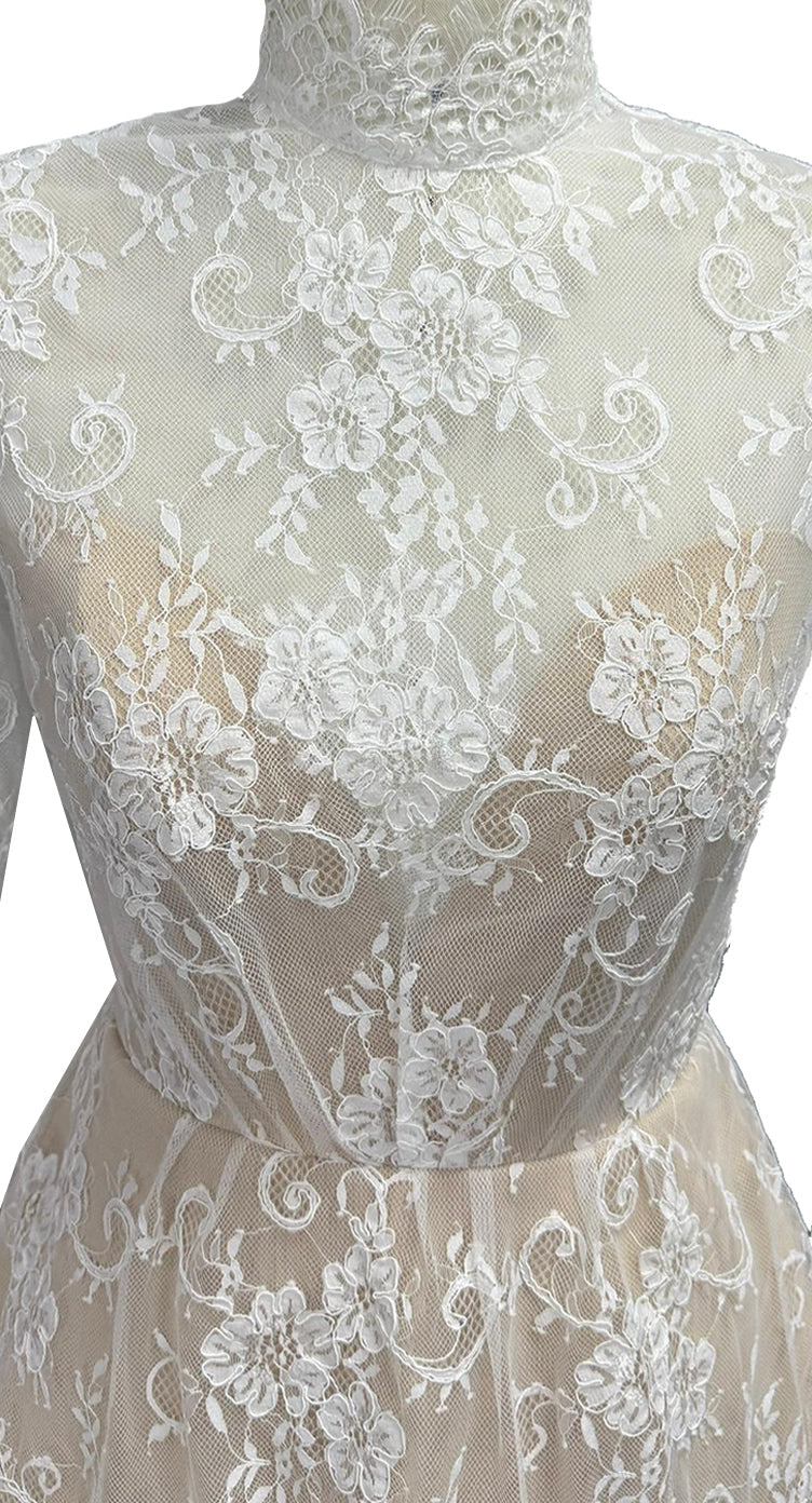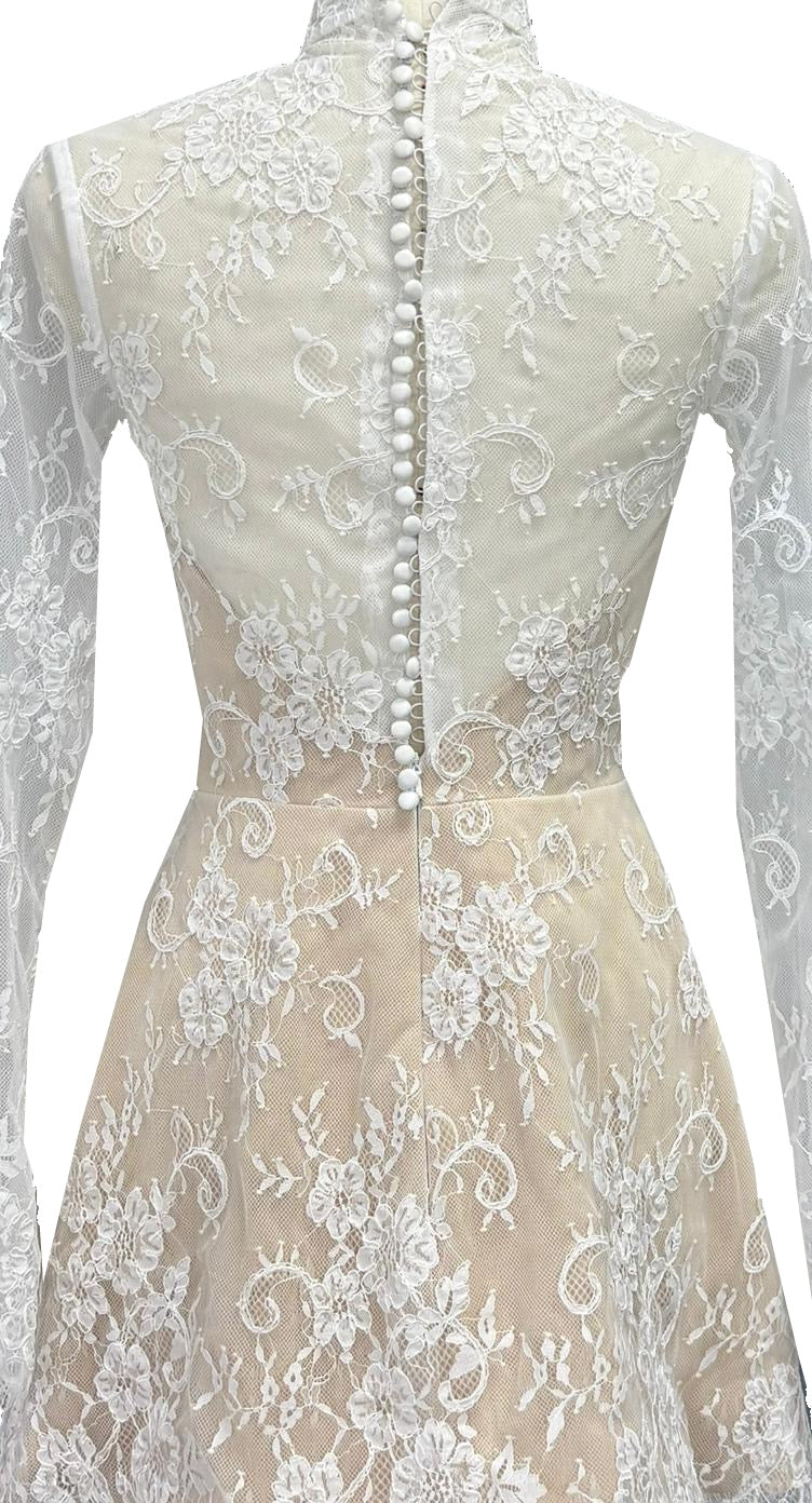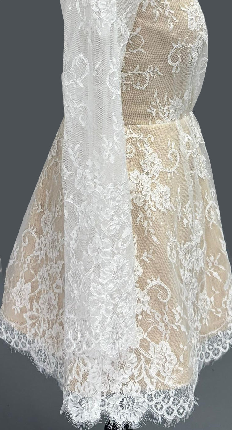 Regular price £750This short lace stunner brings all the sparkle-city energy without a single sequin. With its delicate floral lace, curve-flattering silhouette, Glitter Box is here to rewrite the rules. Flirty, twirl-ready, and dripping in delicate floral, chantilly lace, this little beauty brings big-day magic without taking itself too seriously. It’s perfect for brides who want elegance with a wink—sweet up top, party on the hemline, and guaranteed to make your walk down the aisle feel like a joyful strut. Light, lovely, and totally unforgettable.