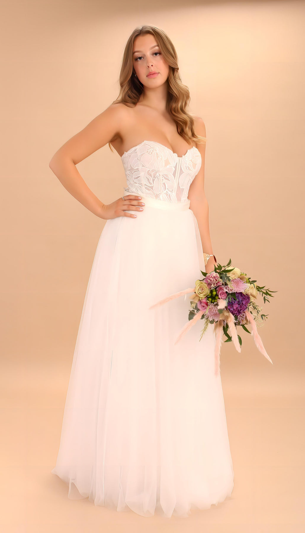 Boned bodice with soft lace overlay and applique. Layered nude & ivory tulle skirt with organza and a light-weight satin lining. Tulle, dropped shoulder straps. Beautiful a-line wedding dress. Bloom is an extremely flattering dress for any size and works for many shapes.